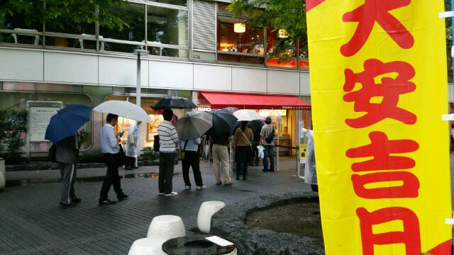| 10月最初の大安吉日の西銀座CC前の広場は、朝からの雨ですが1番窓口には行列が途絶えません。 | ここに来て高額の宝くじが多い中、前後賞を含む3億9千万円は魅力が薄いのかバラが売れてるそうです。 | 午後からは晴れて27℃の蒸し暑い天気になる予報ですが“大安吉日”と“午前中”での購入代行に拘ります。 | 1番窓口には『1』と『大安吉日』が表示されここでの購入だと億万長者が生まれることを予感させます。 |